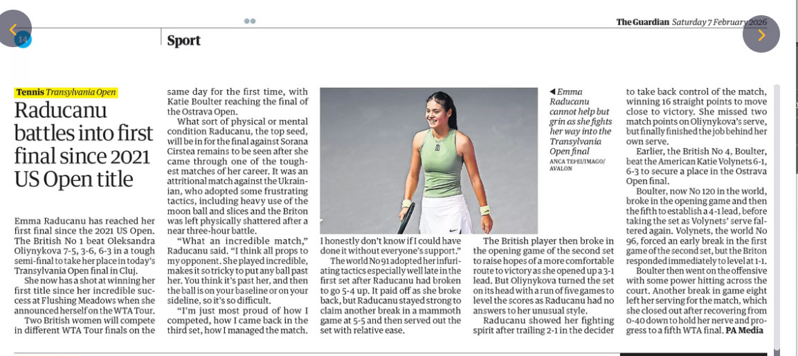 Emma Raducanu ROU, Cluj-Napoca: Transylvania Open 2026, Singles, Semi-Finals WTA, Tennis Damen Tennis Damen 250: Transylvania Open Jan 31 - Feb 7, 2026 MAGO/Anca Tepei/Avalon